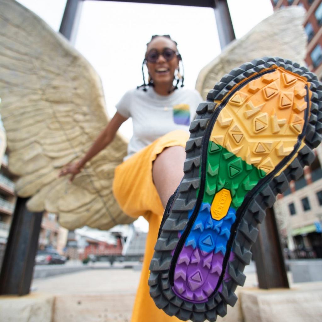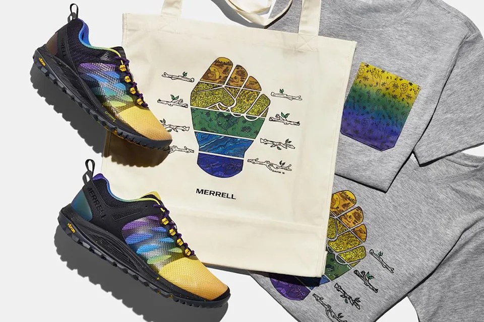 The recent pinnacle was collaborating with Merrell on their Outdoors for All collection, which prominently featured a raised fist categorized and colored by different environments. Her work is featured on shoes, hats, shirts and tote bags, massive exposure for someone who’s proud her art is being used by others to feel more seen, heard and supported in an outdoor community and culture that doesn’t usually feel made in their image.