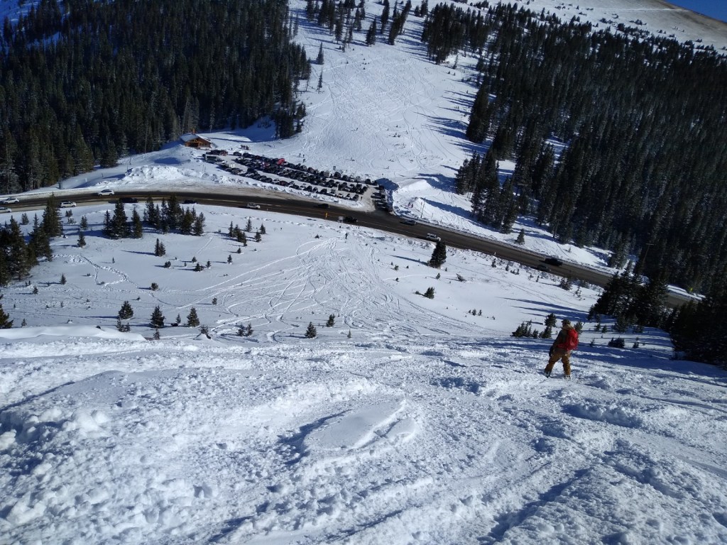 As I caught my breath at a water break my eyes wandered over the small expanse to the eastern slopes of the Berthoud ski area and I noticed a group of three making their way up a barely–snow-covered shoulder. Two people talking about their dog-sitter horror stories scurried by us. I could see a person further west of us just starting down a sweet little rolling line two hills over.